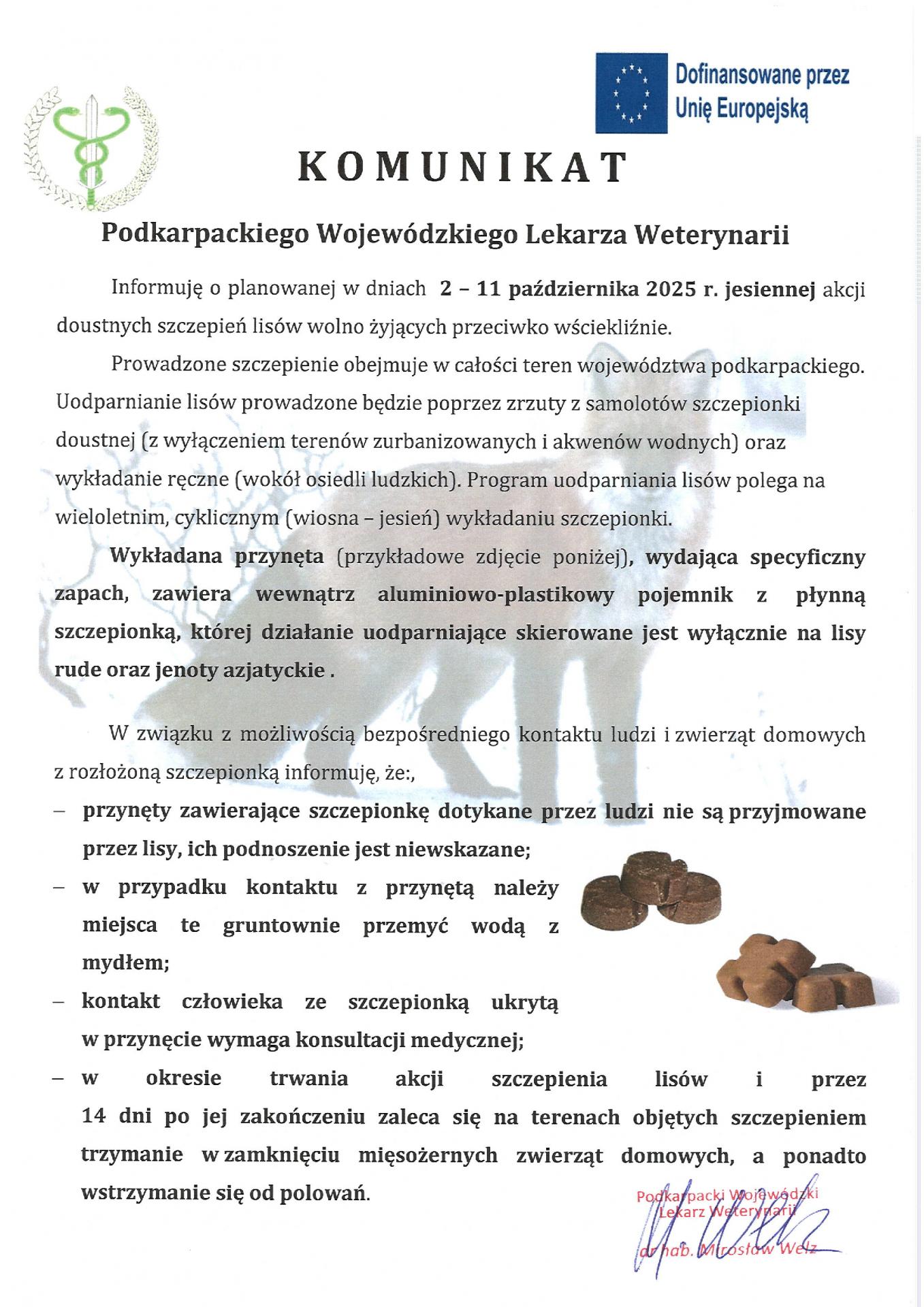 uprzejmie informuje o planowanej w terminie 2 - 11 października 2025 r. jesiennej akcji szczepień lisów wolno żyjących przeciwko wściekliźnie na terenie woj. podkarpackiego.